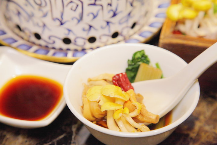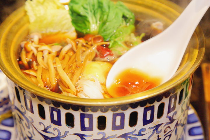 こちらのしゃぶしゃぶは、中国・雲南省にある山岳地帯シャングリラでとれた約30種類の天然きのこを8時間かけて煮込んで作った“ブラックスープ”が主役。まずはスープを飲み、きのこから染み出た濃厚な旨みが口の中に広がっていくのを感じましょう。