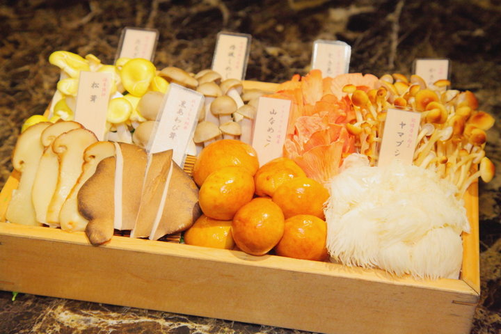 「美楽黒湯」(5184円)のきのこ8種盛り。種類は日替わりで、写真は2人前