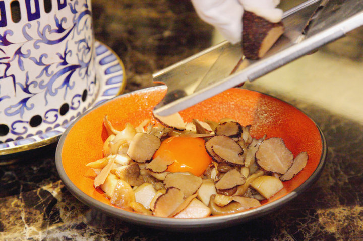 「伊勢神宮ご奉納たまごをのせたトリュフかけキノコご飯」(1620円)。目の前でトリュフを削ってくれる