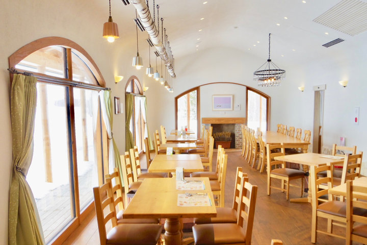 併設する工房でつくったできたてのお菓子やパンをテイクアウトできるショップと、ランチが楽しめるレストラン・カフェがあります。美瑛産のカラマツを使うなど、天然素材にこだわった店内は、旭川の家具屋さんに敷地内にあった白樺の木でつくってもらった照明を天井から吊るし、壁の石は職人さんが手ばりしているというこだわり。