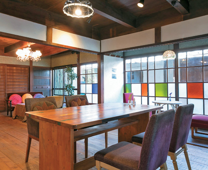 アンティーク家具とカラフルなガラスがすてきな店内。和室もあり
