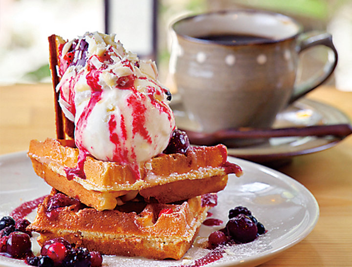 スイーツの看板メニューは、淡路島産卵と牛乳をたっぷり使った、焼きたてのワッフル。ソースやトッピングが異なる9種類のほか、季節ごとに旬の素材を取り入れたワッフルも登場します。 淡路島産の玉葱を2時間かけてペーストし、16種ものスパイスや9種のフルーツを加えて煮込んだ「淡路島カレー」のランチや、カフェの離れの焙煎工房で豆をローストし、島の湧水で入れるこだわりのコーヒーもおすすめです。