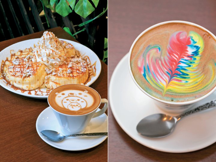 パンケーキのお共には、カラフルな「レインボーラテ」をどうぞ。赤や緑の食紅を使って仕上げるラテは、写真映えするアート感あふれる一杯。 動物などを描く通常のラテアートなら、文字リクエストを受け付けてくれるそう。旅行記念にお願いしてみるのもいいですね。