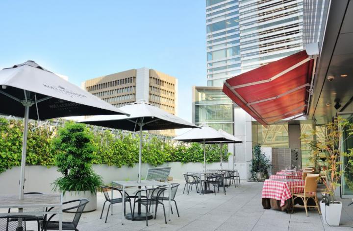 4階のフロアにあるのは「VERANDA」のみ。バーのようなカウンター席、ゆったり過ごせるテーブル席のほか、外には室内よりも広いベランダが。4人掛けのテーブルが8つ、席の間をゆったりととって並べられ、街の喧騒を感じさせない贅沢な空間です。昼は青空と柵にあしらわれた緑がまぶしく、爽やかに過ごせます。夜は星空のもとテーブルにキャンドルがゆらめき、ロマンチックな雰囲気です。
