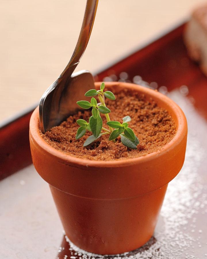 コースのデザート、「竹鶏たまごの植木鉢プリン」も話題を呼んでいます。店名のベランダにちなんで、小さな素焼きの器に、土をイメージしたココアパウダーと芽に見立てたミントの、見た目も楽しいスイーツです。さらにはスプーンまでシャベル型。口あたりは少ししっかりめで、白石蔵王産「竹鶏たまご」の上品な甘さを感じられます。