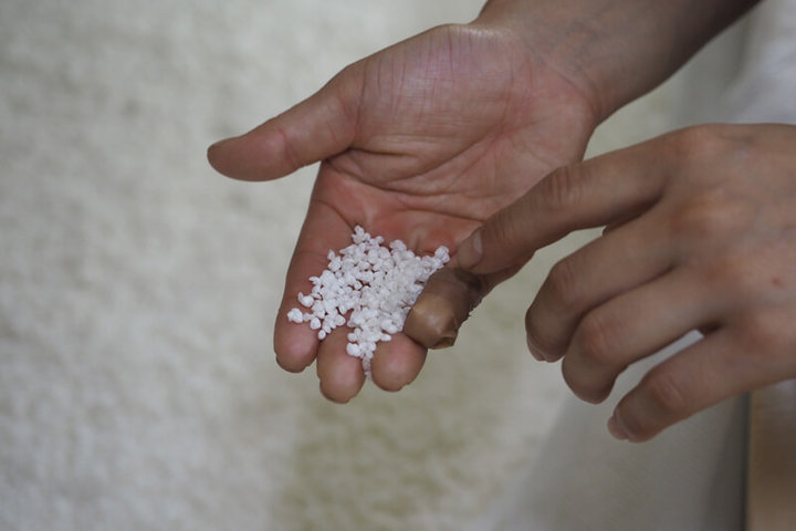 蒸したお米に麹菌を吹きつけ約3日、麹(白く見える部分)を仕込む。温度管理が大切