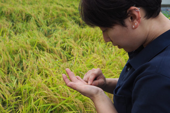 地元に根ざした企業であるというのも、平和酒造の特徴です。 「工場の裏の田んぼで『山田錦』という酒米をつくっています。地元の人たちとは農作業を通じて交流が生まれますね。3年目になると、野菜をいただいたりする関係になりました。台風などの天候に左右される部分もありますが、農作物は『人がつくっている』という実感を持てるのがうれしいです。」