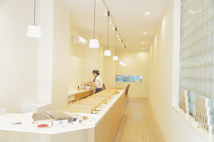 店内はモダンで洗練された空間。カウンターにずらりと置かれた木箱をのぞき込むと、定番から季節のものまで、10種類前後のほっこりとかわいらしい和菓子が並んでいます。