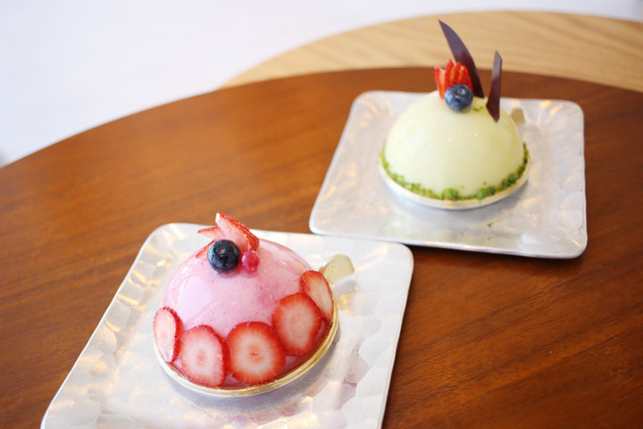 三十三間堂や京都国立博物館が建つ七条通に面した、開放的でスタイリッシュな空間。 ショウケースをのぞくと、色とりどりの華やかなスイーツが並びます。 じつは、どれも京都で古くから重宝されてきた食材「お麩」が使われています。パティシエは、目の前で華麗なスイーツを仕上げてくれるアシェットデセールの専門店として評判が高い、四条河原町「デセール・ラ・フラムブルー」の鈴木一也さんと聞いて、期待が高まります。