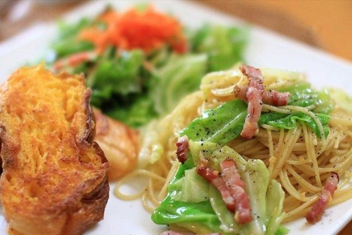 この日のメニューは「春キャベツとこだわりベーコンのパスタ&フレンチトースト」