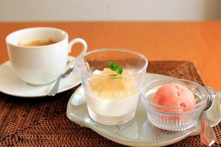 この日のセットメニューのデザートは「自家製スイカのジェラートとパンナコッタ&梨のコンポートジュレ」