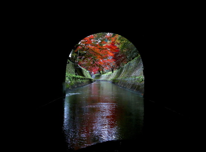 「びわ湖疏水船」の見どころのひとつがトンネル。真っ暗でひんやりとしたトンネルの中は非日常的な雰囲気。合計4つのトンネルの中でも第一トンネルは全長2,436mあり当時では日本最長だったのだそうです。