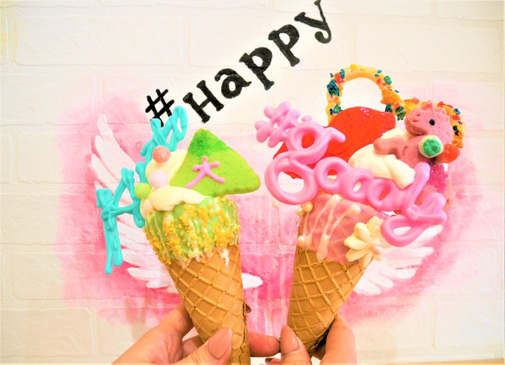 ひとつひとつのコーンは、ピンクやブルーなどカラフルなチョコでコーティングされ、さらにクッキーやチョコがたっぷりデコレーションされ、見た目も華やか。
