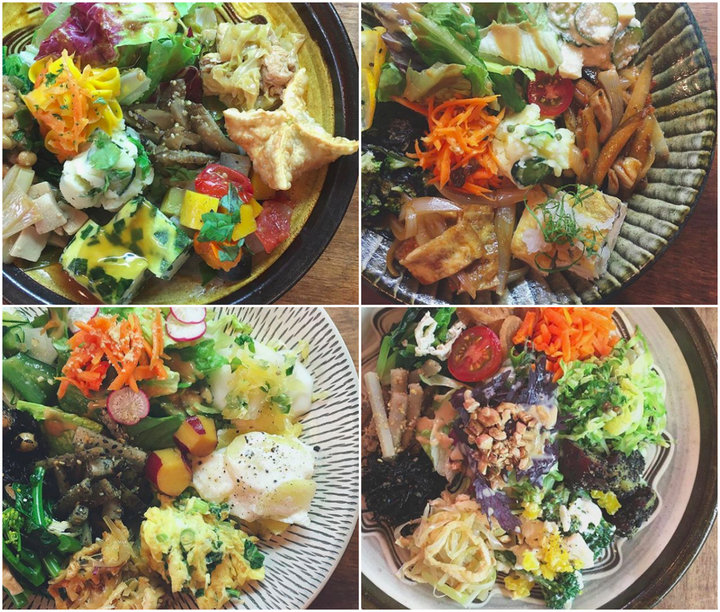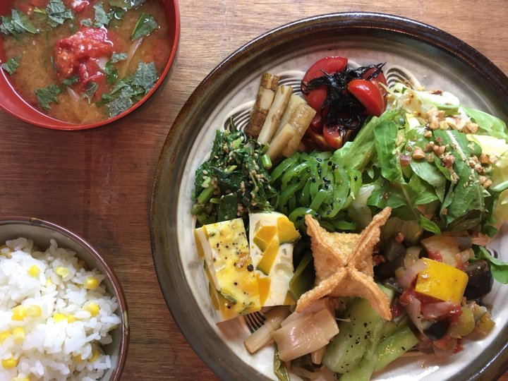 この日の「日替わり定食」は、15品目の野菜が食べられる贅沢な一皿。 その内容はというと… 新玉ねぎとミニトマトのサラダ、きゅうりとひよこ豆の味噌和え、新ごぼうのゴマ和え、紫キャベツのコールスロー、さつまいも(シルクスイート)のコロッケ、人参のサラダ、ひじきとツルナの和え物、ズッキーニと新玉ねぎとジャガイモのスパニッシュオムレツ風、ツルナとニラの豆腐乗っけ、ミックスグリーンサラダ …と盛りだくさん。 毎日、野菜の旬や出荷状況によってメニューが変わります。肉や魚は一切使っていないのに野菜だけで充分な満足感があり、男性のリピーターも多いそうですよ。