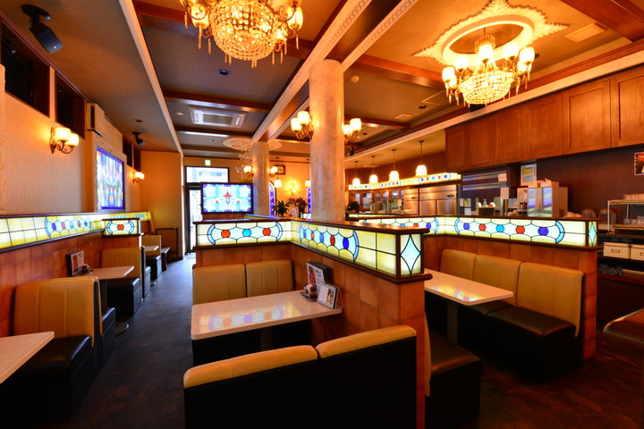 残された写真や記憶を元に、以前の店内をできるだけ再現した新店を2014年にオープン。震災前の店と同じようなキラキラ光る大きなシャンデリアや、壁などに配されたカラフルなステンドグラスが地元の人には懐かしく、観光客にはレトロで新鮮な喫茶店として、今では幅広いお客さんに親しまれています。