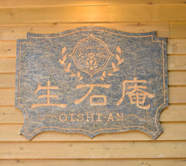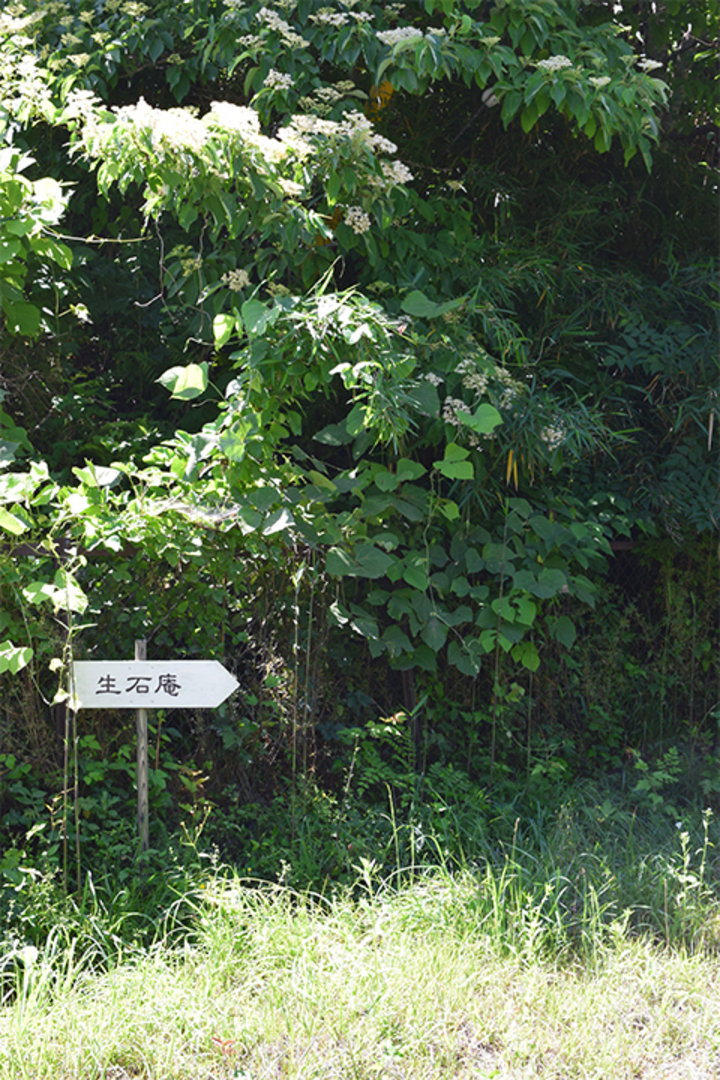 三陸自動車利府中インターチェンジを降りて車を走らせること約7分。一般道から「森郷キャンプ場」へと続く砂利道を進んでいくと、「生石庵」と書かれた小さな看板を見つけます。