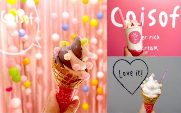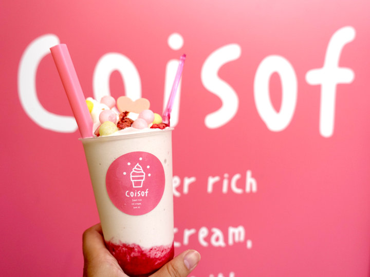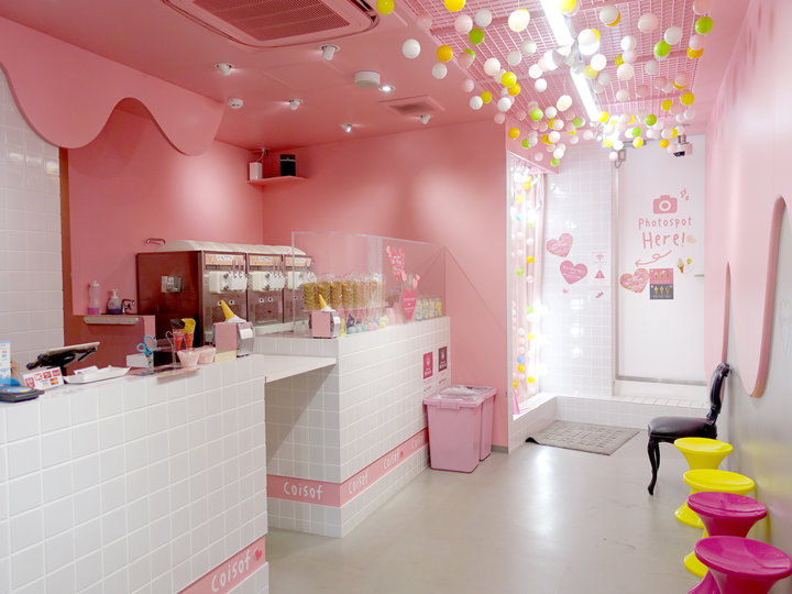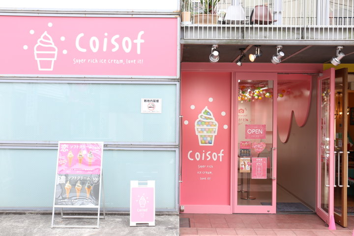 JR原宿駅を下りて、竹下通りをまっすぐ進み、一本右へ入るとすぐに「coisof(コイソフ)」が見えてきます。ピンク色の内装が可愛らしいこちらは、2017年8月にオープンしたソフトクリーム専門店です。