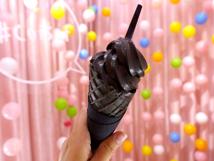 そして、こちらの真っ黒なソフトクリームが黒ごま味の「ゴスソフト」。黒さの秘密は、食用の竹炭を使っているから。 「ブラックフード」はアメリカやヨーロッパでも話題となりましたが、天然のミネラル分が豊富な竹炭は健康効果も期待できます。ココアパウダーも入っていて、ほんのりビターな大人の味わい。 超濃厚な北海道ミルクを使った「ゴスソフト 白」に、両方の味が楽しめる「ミックス」もありますよ。