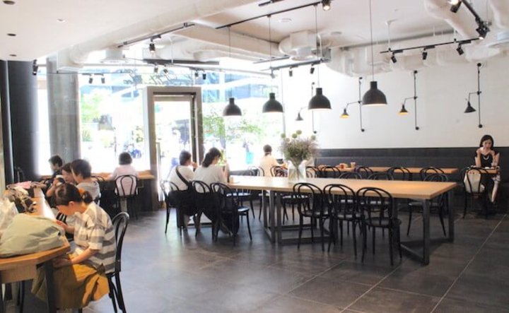 店内には、購入したパンや飲み物を味わえる広々としたイートインスペースがあります。バルミューダのトースターも設置されているので、お好みでパンの焼き直しもできますよ。