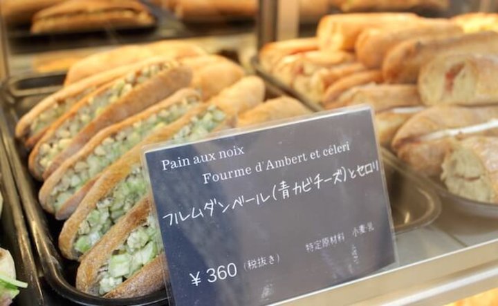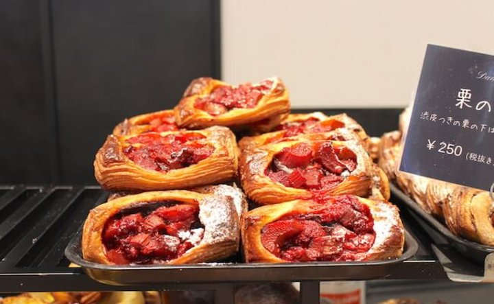 メニューには、「ルバーブのデニッシュ」や「パン・オ・フロマージュ」、「ブリーチーズのサンドイッチ」などフランスらしいものから、「大葉とベーコンのパン」、「渋皮つき栗と柚子のパン」など、ハード系のパンに日本人に馴染み深い素材を加えたユニークなものも。