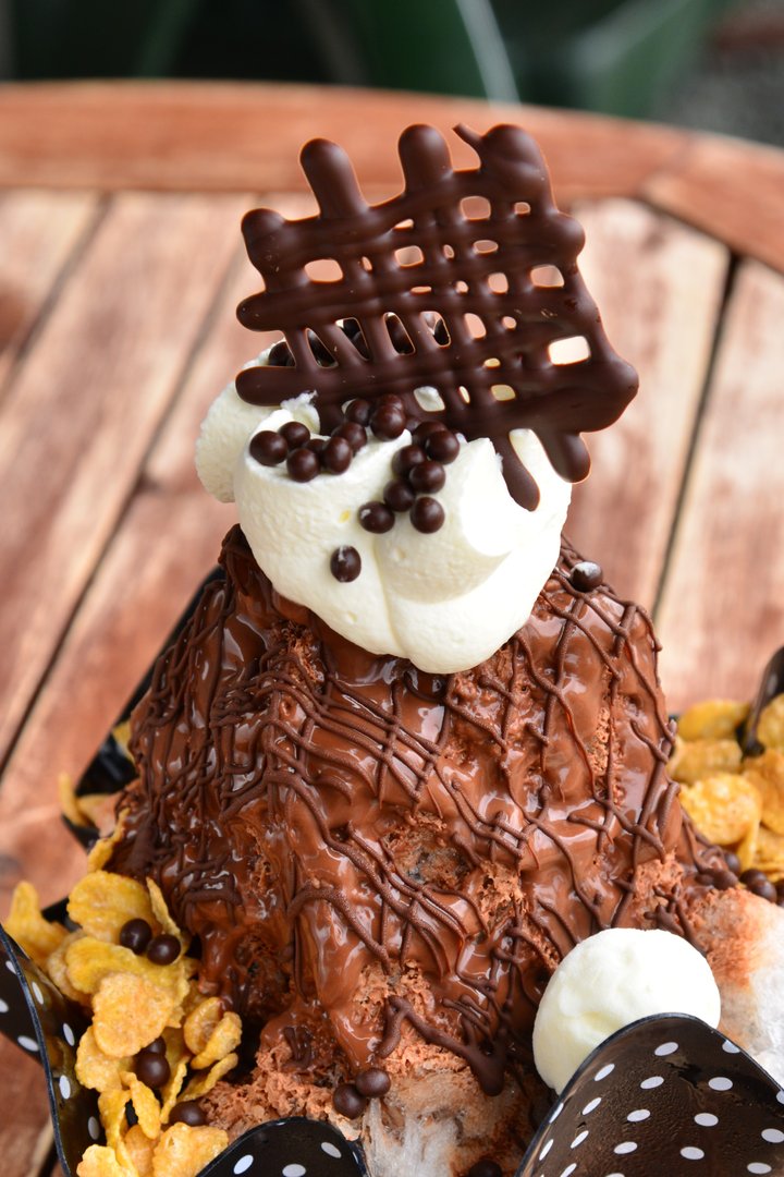 カカオの甘い香りに包まれるチョコレートケーキのような「ショコラ」は、今シーズンおすすめの新メニュー。 かき氷全体にたっぷりかけたソースは、カカオの含有量が多めのフランス産高級ダークチョコレートを使用しています。甘さのなかにもカカオの苦みが感じられる、ちょっと大人なフレーバー。ソースと氷を層にしているので、どこから食べてもチョコレートの濃厚な味が楽しめます。