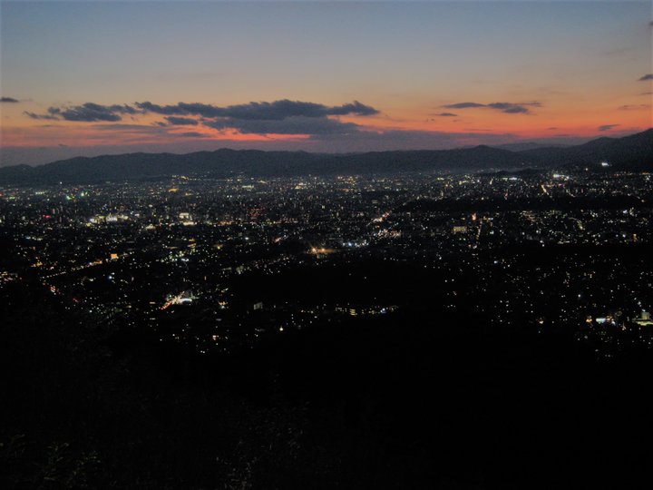 実は夜景スポットとしても知られる大文字山。時間によってさまざまな表情の展望が見られるのも魅力です。夕暮れから夜へ移ろい、街に灯りがキラキラと輝く様子はなんともロマンチック。夜景を目当てに、ナイトハイキングにチャレンジしてみるのもおすすめですよ。