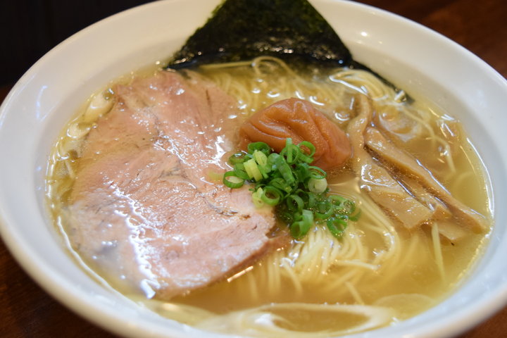 「梅塩中華そば」(750円)。チャーシューには肩ロース肉を使い、脂分を抑え目に