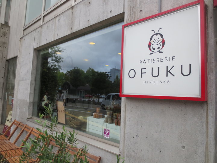 JR金沢駅からバスで約10分のバス停「香林坊(アトリオ前)」で下車。5分ほど歩いて金沢21世紀美術館へ進むと「パティスリーオフク」があります。愛らしいてんとう虫のロゴ看板が目印です。 この辺りは、兼六園や金沢城公園も近く、観光スポットが集まるエリア。1階はケーキやチョコレート、コンフィチュール、焼き菓子などが並ぶショップで、螺旋階段を上った2階は金沢21世紀美術館や周囲の緑を見渡せる気持ちの良いカフェスペース。観光や散策の合間のくつろぎスポットとなっています。