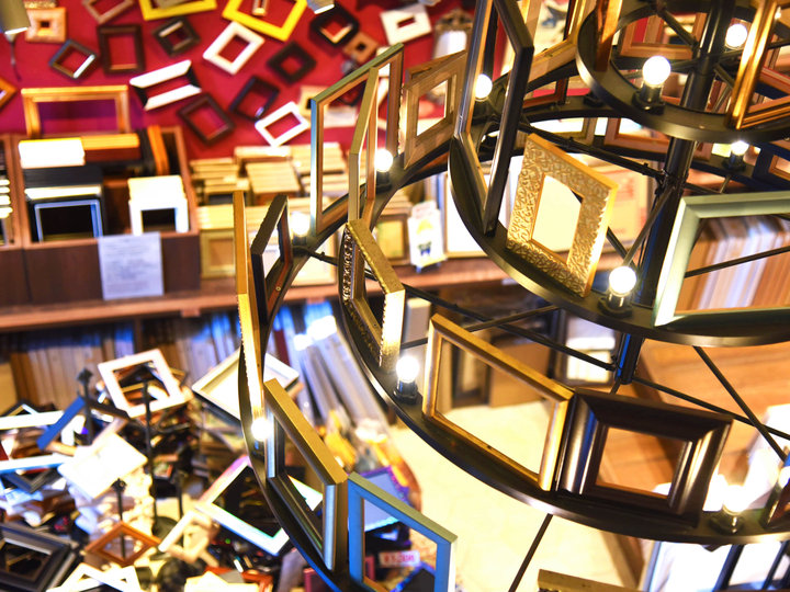 「高山額縁店」は、名古屋駅から歩いて15分程度、堀川に架かる納屋橋のすぐそばにあります。 店内には多種多様な額縁がずらりと並び、その豊富な品ぞろえは老舗の専門店ならでは。照明などのインテリアにも額縁が使用されています。