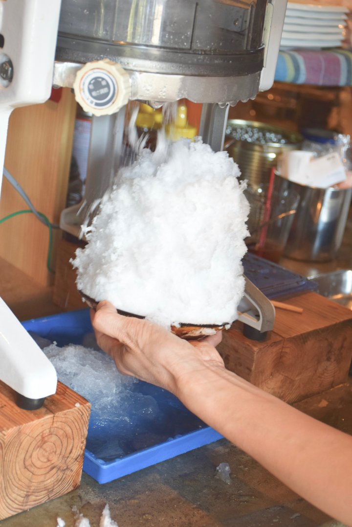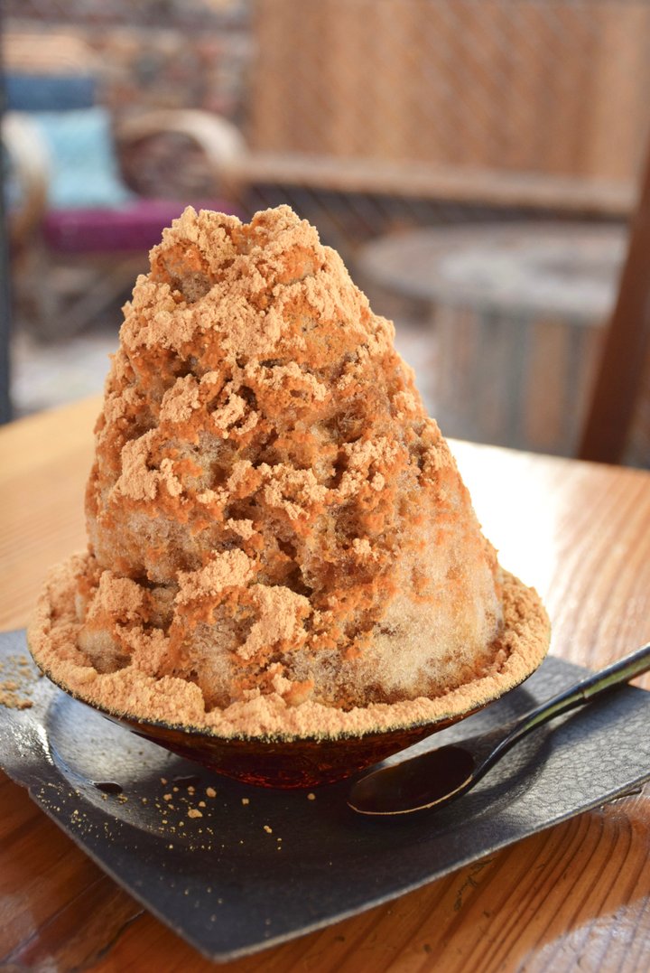 中でも看板メニューは、黒蜜ときなこ。素早く氷を削りながら山を作り、食べ進めても美味しさが続くようにと山の中腹でせんじのシロップを追加。きれいな山ができ上がると、沖縄の黒糖で作った黒蜜をたっぷりとかけ、和菓子店から仕入れる上質で風味豊かなきなこをこぼれ落ちるほど贅沢にふりかけます。口に入れた瞬間、ふわりと溶ける軽い食感の氷を、和の素材ならではのやさしい甘さが包み込む。思わず頬がほころんでしまう、繊細な味わいです。