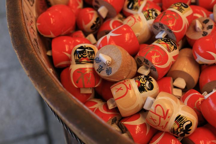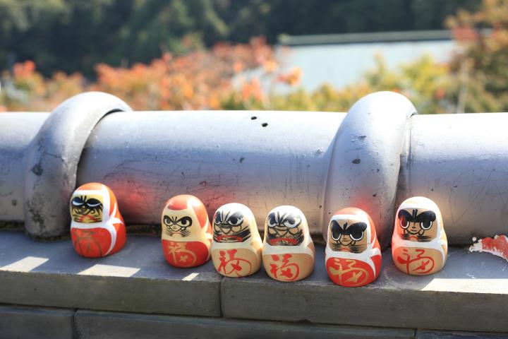 境内のあちこちに小さなダルマが置かれていますが、これは「ダルマみくじ」を引いた人が境内に置いていったものなのだそう。ダルマは手書きで描かれているので、よく見るとひとつひとつ表情が異なります。一列に並んでいたり、木陰にたたずんでいたり。お寺の方に話を伺ったところ、あえて片付けずそのままにしているそうです。