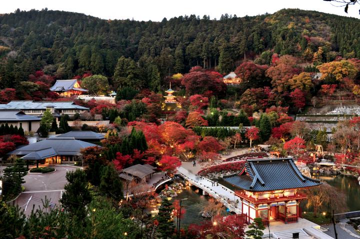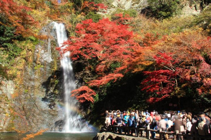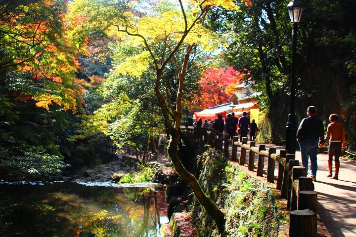 大阪・梅田から電車で30分ほどで行ける箕面(みのお)市。阪急箕面駅から徒歩5分ほどで自然豊かな明治の森箕面国定公園の入り口に到着します。箕面大滝に至るまでは遊歩道が整備されていて、秋は紅葉の名所として知られる場所です。例年紅葉の見ごろは11月~12月上旬ごろ。赤や黄色に染まる木々が山や小道を埋め尽くす、美しい景色が広がっていますよ(写真は瀧安寺)。