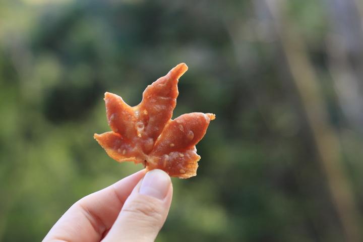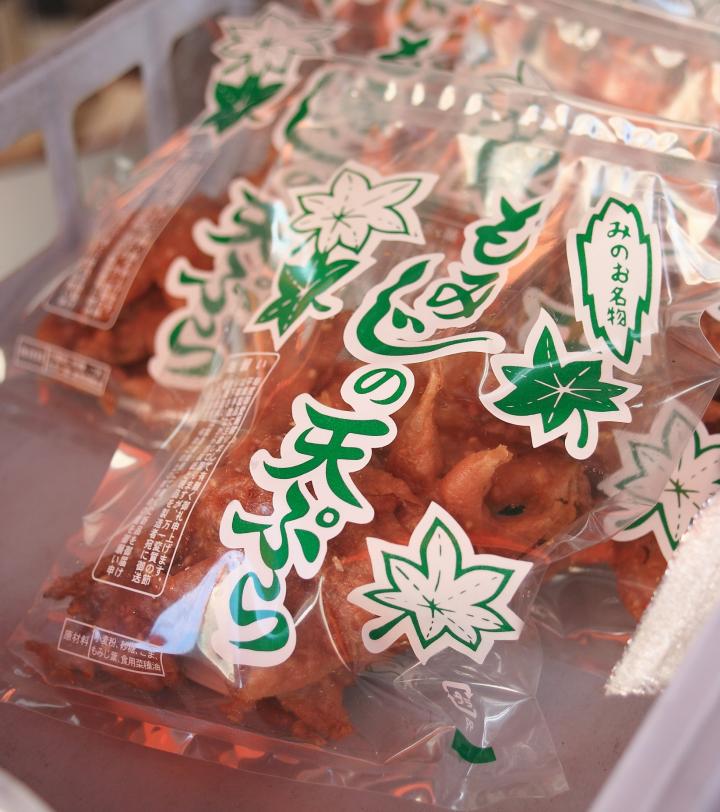 滝道を歩いていると、みやげ物店の店先で揚げ物をしている風景をあちこちで見かけます。これが箕面名物として知られている「もみじの天ぷら」です。もみじが食べられるの?と驚きますが、食用もみじに甘い衣をつけ低温でじっくり揚げているので、かりんとうのようにカリッとした食感でとてもおいしいのです。お店ごとに少しずつ味も異なるので、食べ比べてみてくださいね。