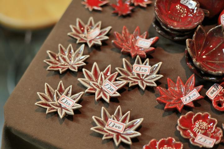 そんな食べ物のお店が多いなか、真っ赤な器ばかりが並ぶ店を発見しました。もみじの形をしたお皿や箸置きなどは、おみやげにもぴったりです。「箕面焼」と呼ばれる独自の製法で仕上げる焼き物で、この美しい赤い色を出すのに何年もかかり苦労をされたそう。今では縁起のよい贈り物として人気を集めています。 ○箕面焼窯元 [住所]箕面市箕面1-4-5 [電話]072-721-2650 [時間]9:00~18:30 [定休日]なし