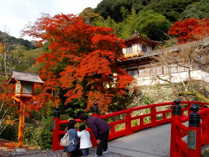 箕面大滝への道の途中の脇道からは山歩きの装備が必要ですが、約1時間で紅葉が美しい名刹「勝尾寺(かつおうじ)」へも行くことができます。このお寺は勝運の寺としても知られ、奉納したダルマが無数に並ぶ「ダルマ寺」として有名です。
