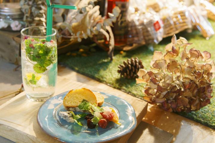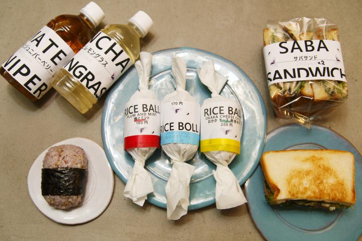 左上:「マテ茶とジュニバーベリー」、「煎茶とレモングラス」、中央:おにぎり「梅とミント」、「魚のセビーチェ」、「おかか・チーズ・チリ」、右上「サバサンド」