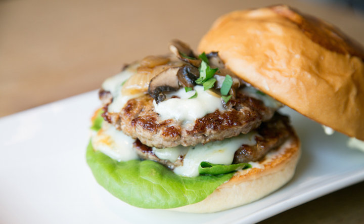 日本限定メニューの「ウマミノコバーガー」。ビーフパティを2枚重ねることで、食べやすく、よりジューシーな味わいに。そのうえには、ゴルゴンゾーラチーズと、マッシュルームにソテーオニオンがのっています。
