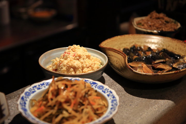 カウンターに並ぶのは、旬の京野菜を使ったおばんざいの小鉢。オーガニック野菜ソムリエでもある料理長の「極力動物性のものを使いたくない」との思いから、ナチュラルな素材を使ったメニューがそろいます。
