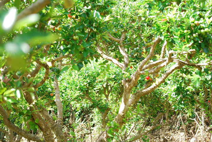 「農業生産法人アセローラフレッシュ」のアセローラ畑。生は収穫から数日しかもたないが、『琉Q(ルキュー)』の「沖縄本部のアセローラジャム」は長く味わえる。沖縄はアセローラ栽培の北限地で、国産アセローラの生産者は同法人を含めてわずか30軒ほど。