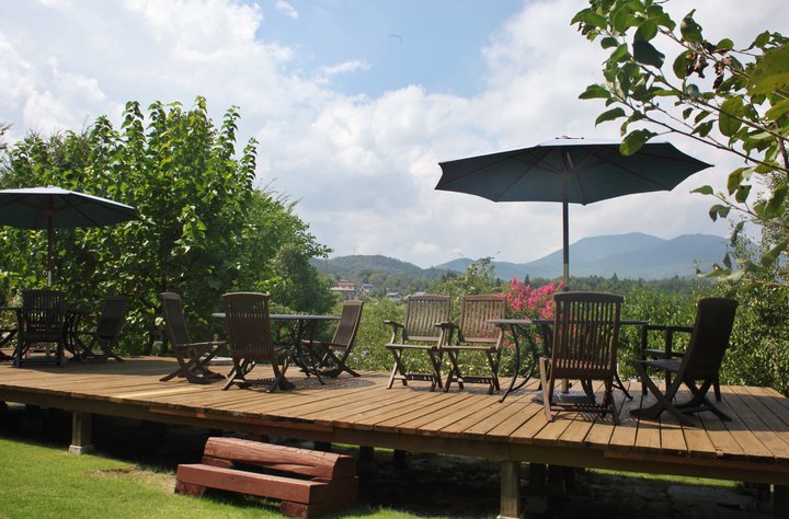 園内の散策道の途中にはベンチやテラス席もあるので、購入した商品を屋外で味わうのもおすすめ。見晴らしのいいテラスからは恵那山を望むことができます。
