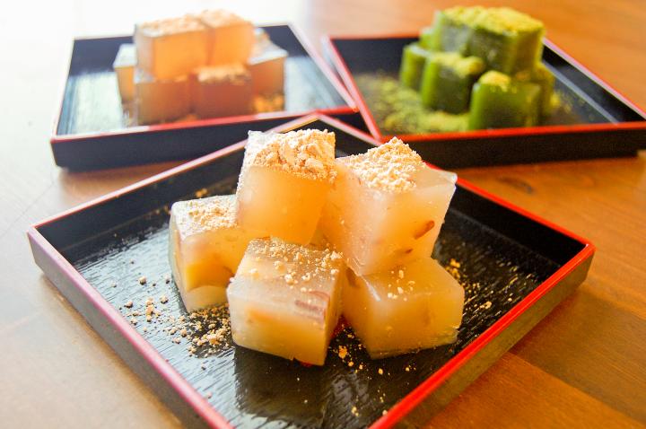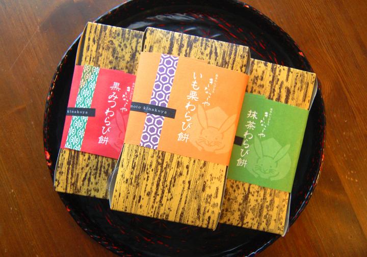 看板商品の熊本わらびもち。いも栗470円、黒みつ430円、抹茶490円
