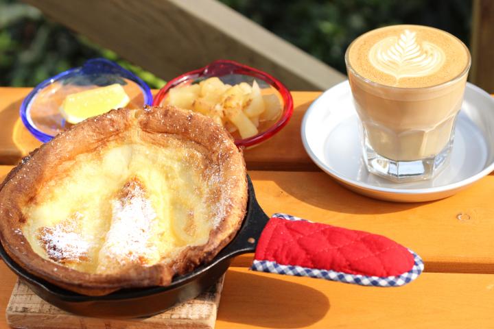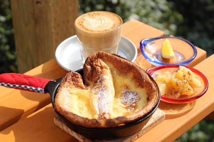 小屋番さんイチ押しの「ダッチベイビー」(700円〜)はお店の人気スイーツのひとつ。オーブンでじっくり焼き上げたドイツ風のパンケーキです。こちらのお店では、スキレットに入ったアツアツのダッチベイビーに煮りんごをのせ、レモンをしぼっていただきます。 ジャーマン生地と呼ばれる特別な生地で作るダッチベイビーは、ちょっと厚めのシュー皮のような、サクサク&モチモチの食感が特徴です。ほんのり塩味を感じる生地と煮りんごとレモンの酸味、粉砂糖の甘味のバランスが絶妙で、通常のパンケーキよりもさっぱりとした大人の味わい。バリスタでもある小屋番さんがていねいに淹れるコクのあるカフェラテによく合います。