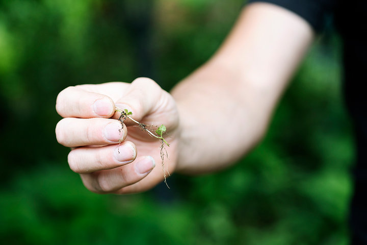 薬草の収穫や栽培をしている農家の田中良昭氏。子供の頃、薬草を取った経験はあるが本格的に始めて14年ほど。知識が増え、新しい品種を発見することや育てることが楽しいという。