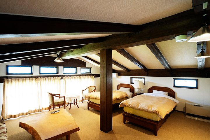 離れにある2階建ての「はごろもの間」。築110年の板蔵は総檜造り。家具は職人技が光る飛騨家具を設える。テーブルは飛騨の一枚板を北平氏が自ら磨いて仕上げた。
