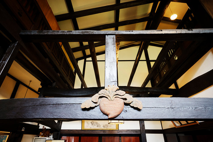 どこか懐かしく、情緒溢れる雰囲気を持つJR高山本線・飛騨古川駅。5分ほど歩くと古い家々や白壁の土蔵が続く町並みや、大きな鯉がゆったりと泳ぐ瀬戸川が見えてきます。観光地としての側面を持ちながらも、地元の人たちの普段の暮らしが垣間見える飛騨古川独特の景色が広がります。 今回訪ねた『蕪水亭(ぶすいてい)』は、町並みを抜けた先、荒城川と宮川が合流する川岸にあります。荒城川は別名「蕪(かぶら)川」ともいわれ、蕪水亭(ぶすいてい)の名前はそこからつけられたそうです。館内にも所々に蕪(かぶら)をモチーフにした装飾が施されています。