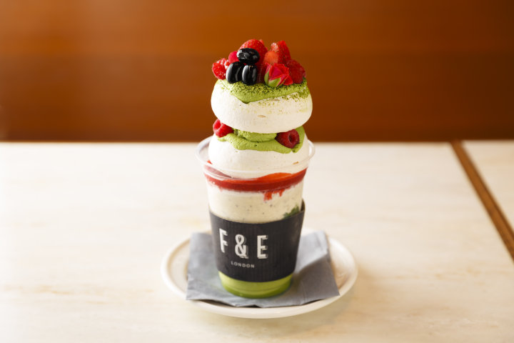 イギリスの伝統スイーツ、メレンゲとフルーツ、クリームなどを豪快に混ぜて楽しむ「イートンメス」。京都限定バージョンはイチゴと丹波黒豆、エディブルフラワーで彩られた見た目もきれいな一品。ほろにが抹茶クリーム、ホワイトメレンゲの下は丹波黒豆のシェイクや抹茶アイスが入っています。甘さは控えめで、爽やかな大人の味わいです。