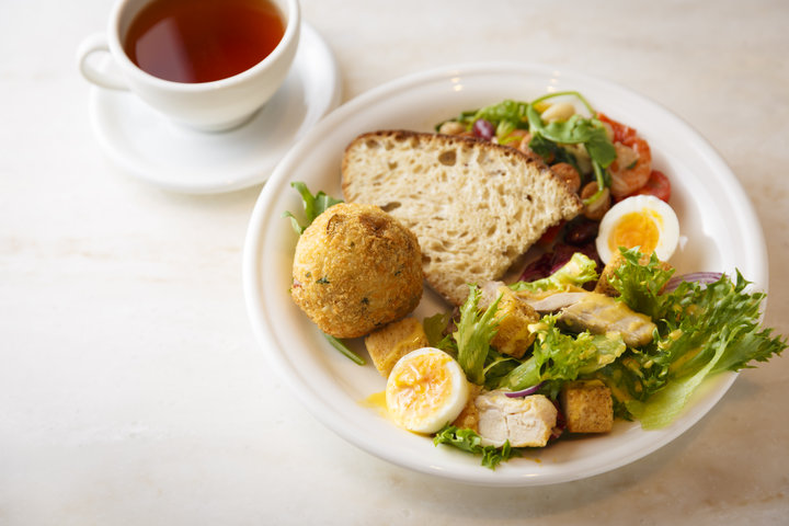 こちらは、好みのホットディッシュ1種と、コールドデリ2種にパンと選べるドリンクが付くランチセット。今回セレクトした、ライスコロッケ「アランチーノ」は人気ホットディッシュのひとつ。ウインナーや季節野菜などがたっぷり入ったボリュームある一品です。