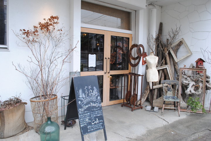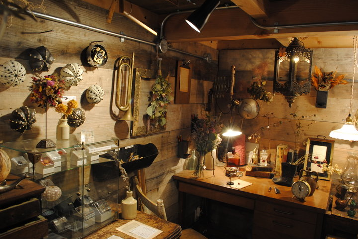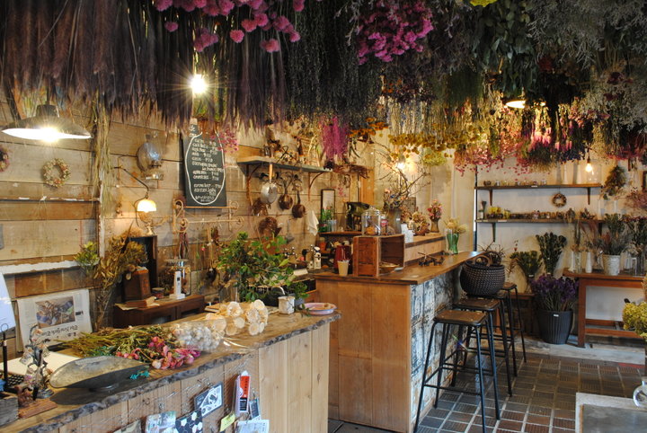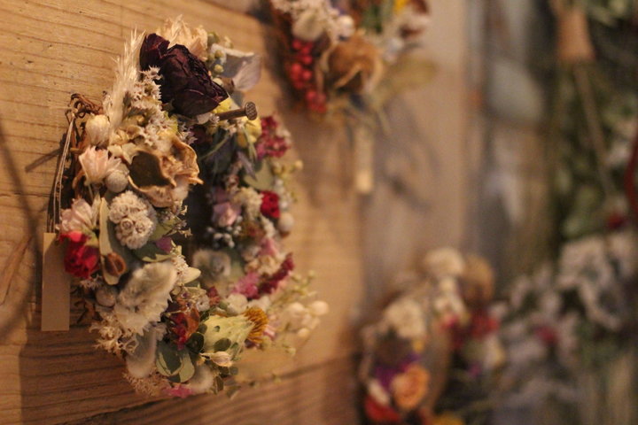 店内に置かれたアンティークの雑貨やシャビーな古道具の数々が、落ち着いた色合いのドライフラワーとマッチして、まるでひと昔前の海外のショップにタイムスリップしたかのような錯覚も。
