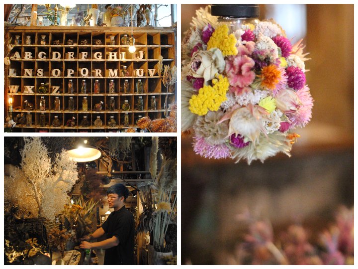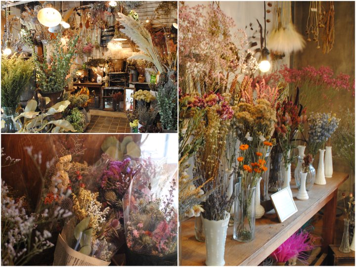 (左上)おとぎの世界を思わせる空間が魅力だ(右)花器や雑貨も販売されている(左下)ドライフラワーの花束もあり。希望に応じてつくってもらえる