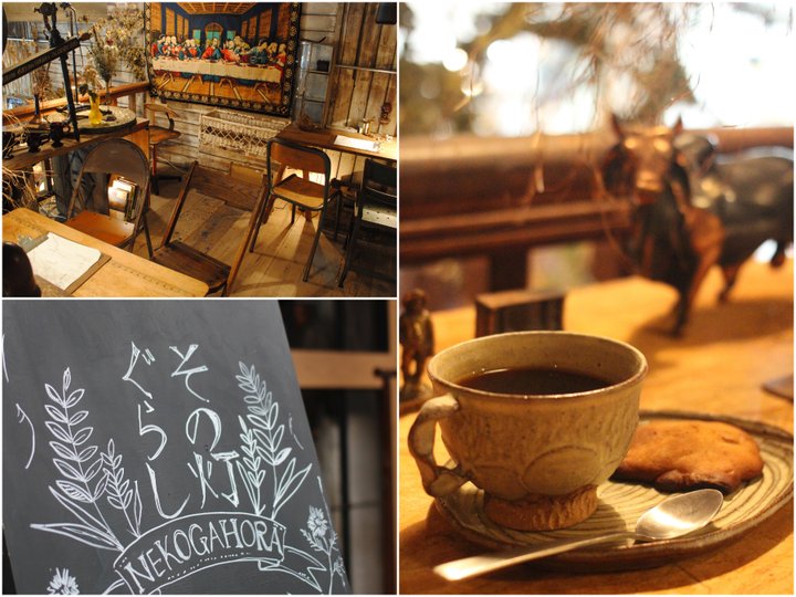 (左上)2階にあるカフェスペース。レトロな小物が飾られている(右)「コーヒー」(450円)、「クッキー」(200円)(左下)ドライフラワーの魅力を発見できるはず
